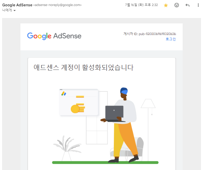 후기를 찾아보니 저와 비슷한 경험을 하신 분들이 많았습니다. 특히 승인 실패 메일을 받은 후 바로 재신청했더니 승인을 받았다는 사례들이 눈에 띄었습니다. '혹시 모르니 나도 시도해보자'라는 생각으로 7월 14일 바로 재승인을 신청했습니다. 이틀 후인 7월 16일, 기쁜 소식이 도착했습니다. 드디어 AdSense 승인이 된 것입니다!